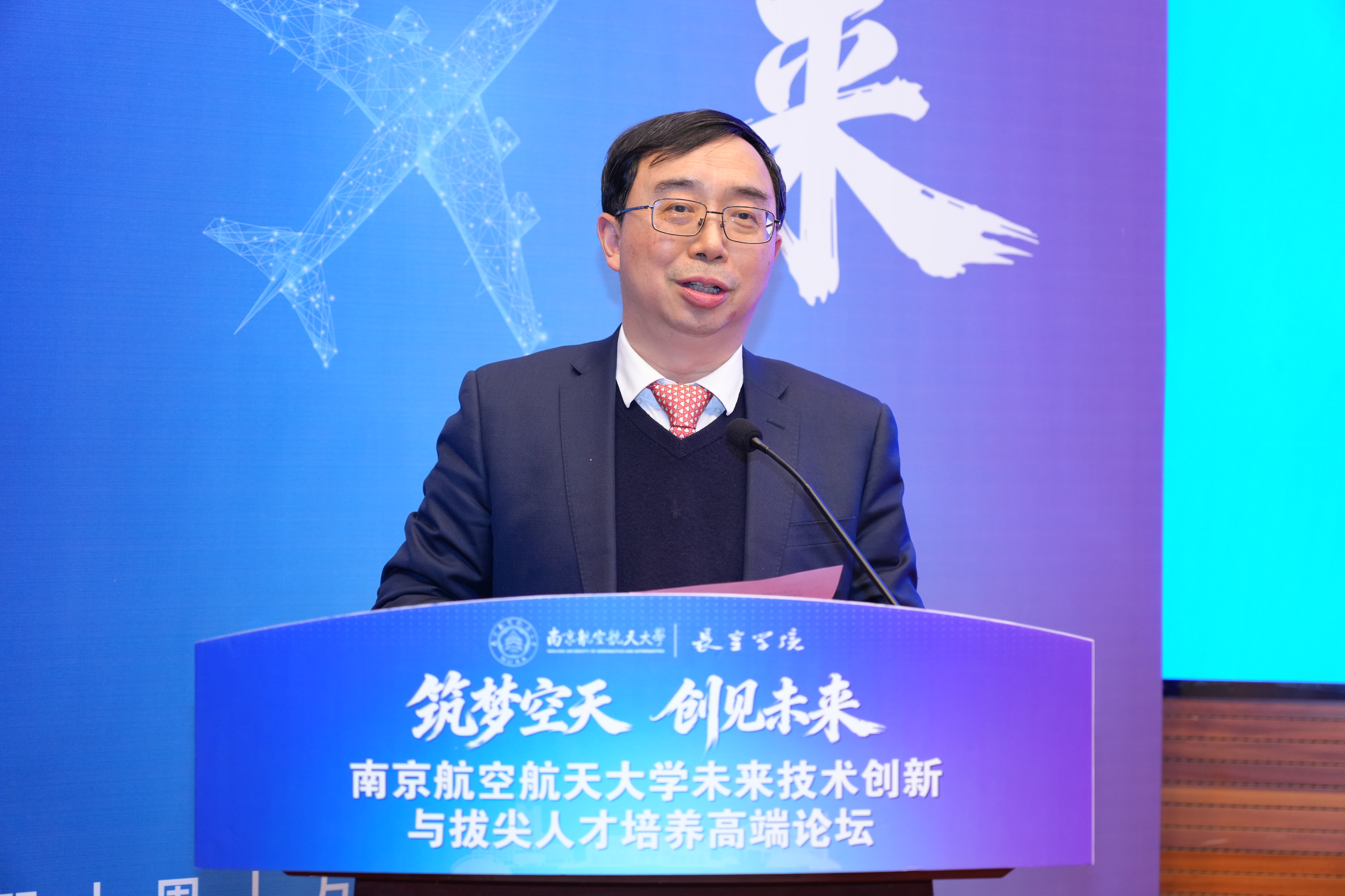 论坛上,姜斌发表致辞,回顾了我校为国家培养众多航空航天领军人才与参与国家重大工程的成就,并宣布未来技术学院正式启动建设。他表示,学院将聚焦“未来空天装备”方向,通过推动学科交叉、深化产学研融合、拓展国际合作,以创新的育人模式和评价体系,着力培养具有前瞻视野和卓越创新能力的高层次人才,为空天事业发展注入持续动能。